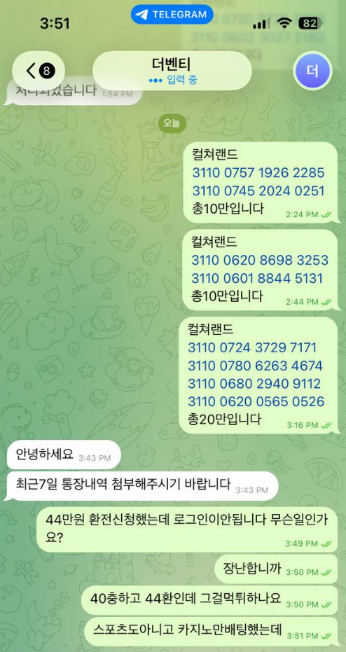 총 40충 44환했는데 환전오래걸려서 이상하다싶었는데 텔와서 7일치거래를보여달래서